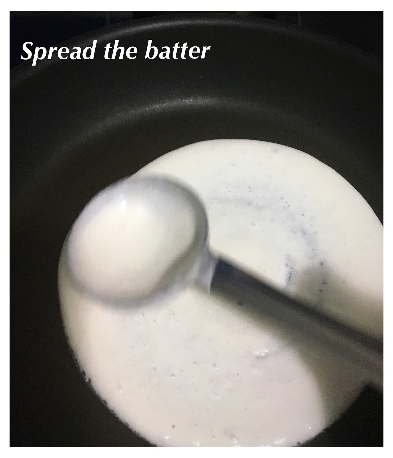 - Using the back of your ladle, gently spread the batter with a circular motion from the center towards the sides of the pan like making pancake.